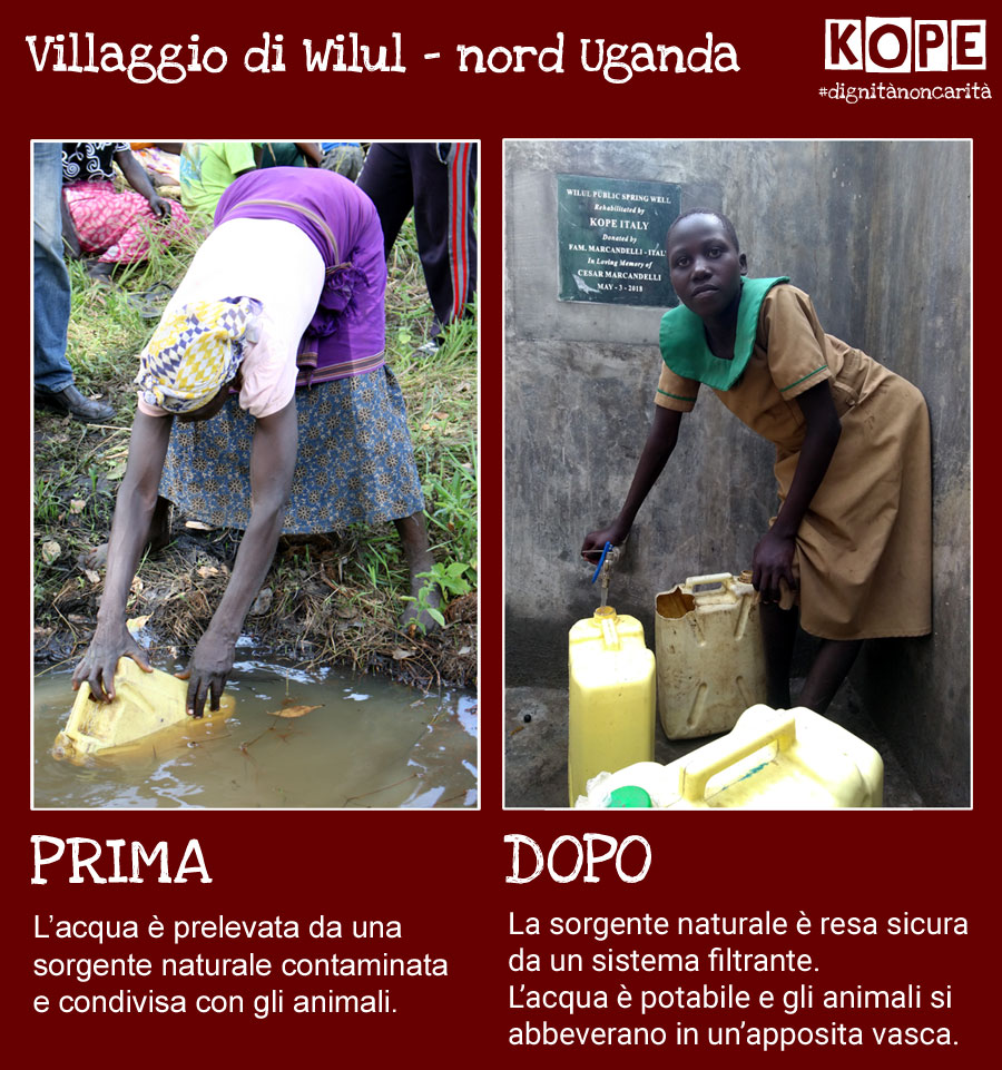 La fotografia seguente rappresenta il modello di struttura obiettivo di questo progetto. Si tratta un pozzo sorgivo realizzato da Kope a Laminadera in nord Uganda. Ricavato da una sorgente naturale è dotato di sistema di filtraggio con sabbie naturali ed agglomerati specifici. Il pozzo sorgivo fornisce acqua potabile a migliaia di persone che vi si riforniscono quotidianamente. Le acque reflue sono destinate ad usi generici, non alimentari.